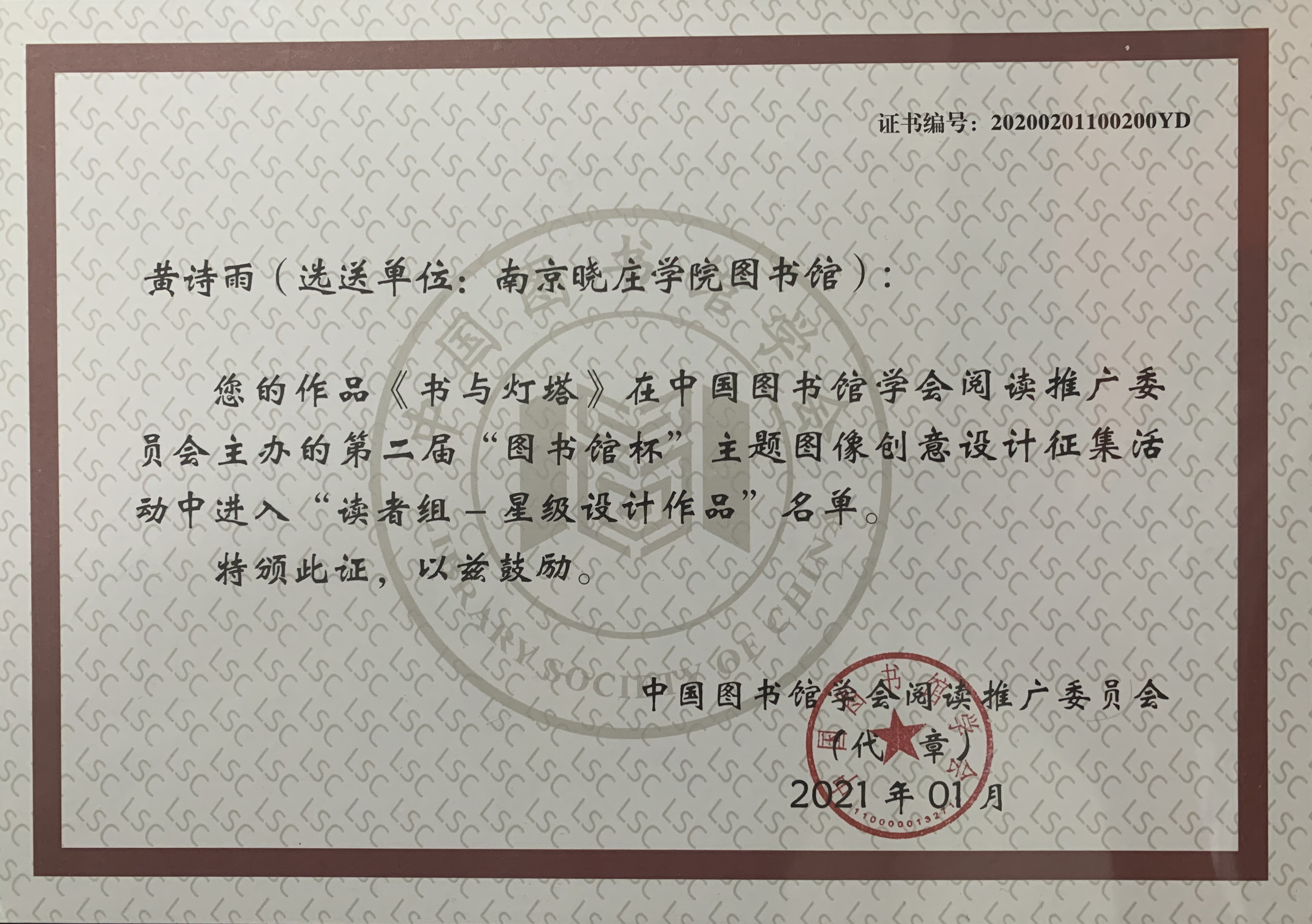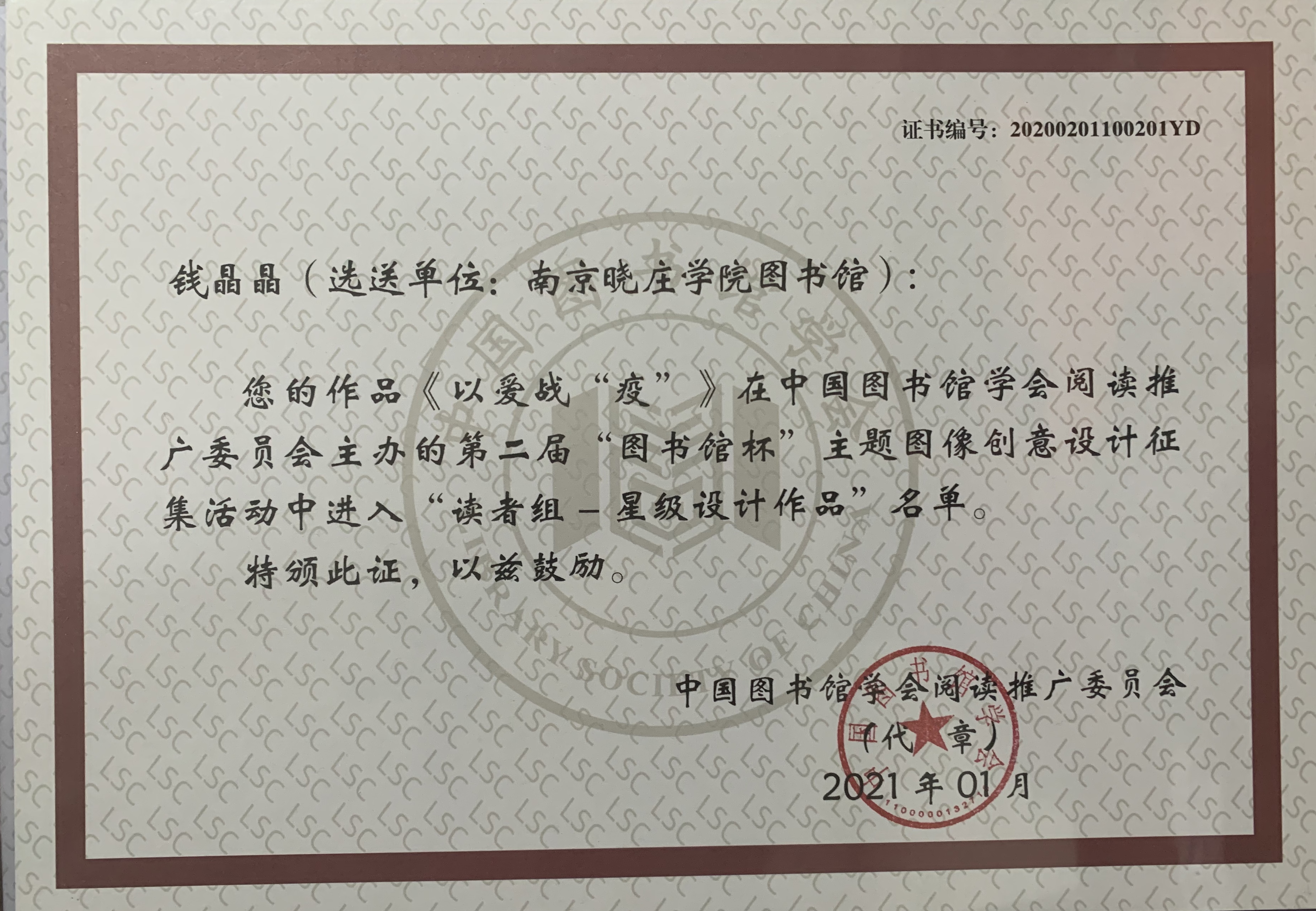 学院视觉传达设计专业钱晶晶同学的作品《以爱战“疫”》、黄诗雨同学的作品《书与灯塔》入选全国第二届“图书馆”杯主题图像创意设计“读者杯—星级设计作品”名单。