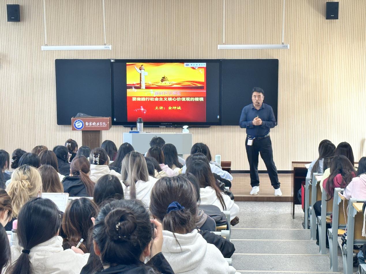 11月12日,美术学院分党校在美术楼236教室举办主题党课,马克思主义学院金坤城副教授以“新时代大学生要做践行社会主义核心价值观的楷模”为题,应邀为入党积极分子、“青马工程”初级班学员讲课。