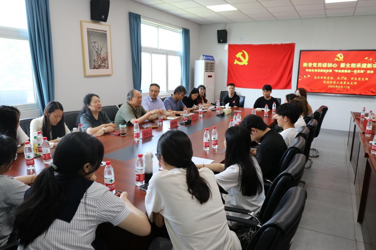 为进一步加强毕业生党员党性教育,做好毕业生离校教育和思想政治工作,引导毕业生党员在党纪学习教育中学思践悟,坚定理想信念,厚植爱国爱校情怀,6月17日,美术学院党委、关工委联合离退休党工委第五支部举办“新老党员话初心,薪火相承建新功”毕业生党员座谈会暨“毕业前最后一堂党课”活动。