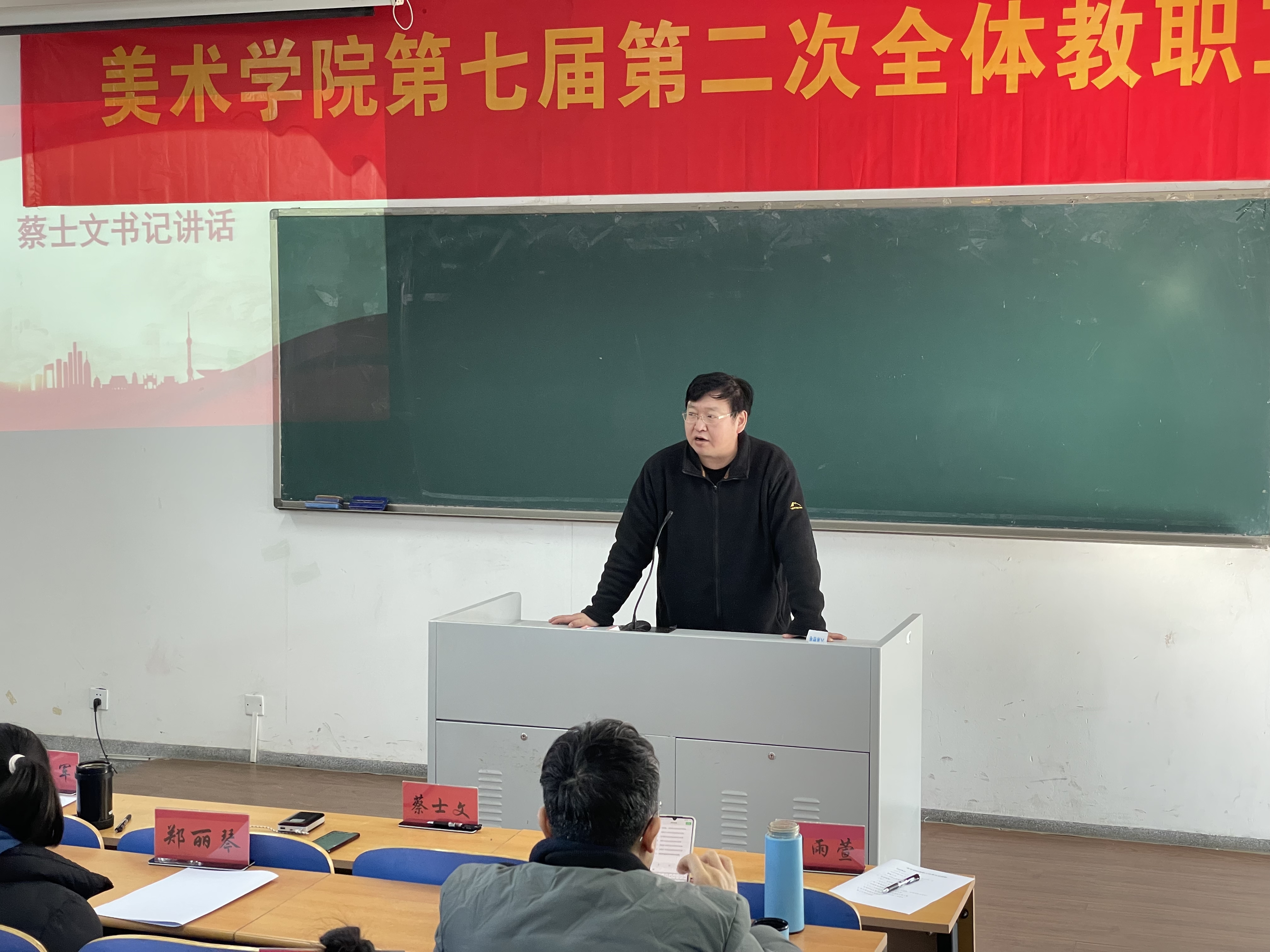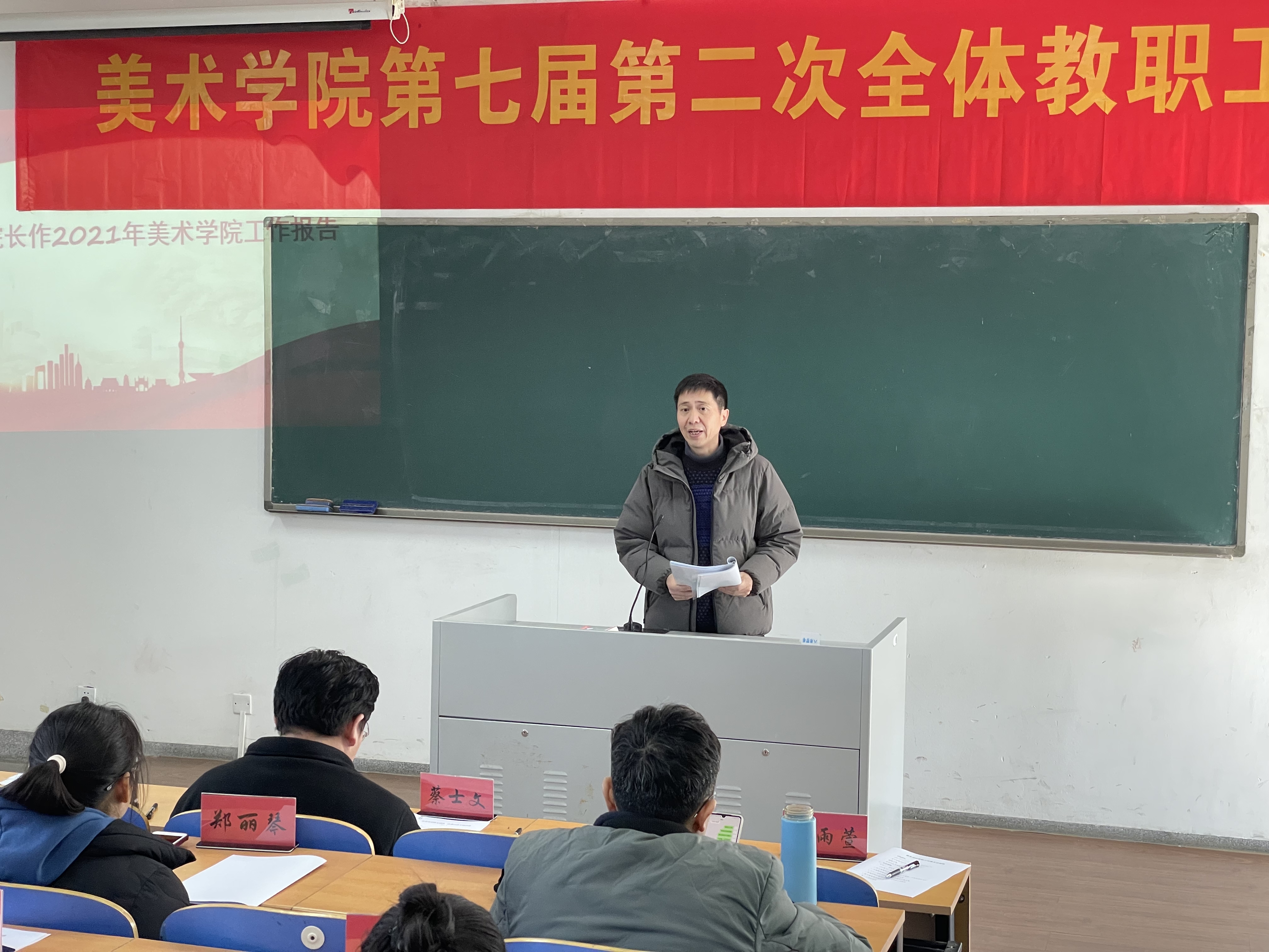 院长张建军作“美术学院2021年度工作总结及2022年度工作设想”的报告。报告从规范专业建设与教学工作、开创学科与科研工作新局面、建设高质量师资队伍、加强实验室工作与安全工作管理等方面对学院一年的工作做了深入详细的总结,各方面都取得了喜人的成果。党总支书记蔡士文从“凝心聚力,画出最大“同心圆”、“率先垂范,发挥模范带头作用”、“和衷共济,助推学院事业发展”三个方面,要求全院教职工坚决贯彻落实学校党委工作部署,结合学院明年的目标任务,认真研究谋划工作,不折不扣把各项工作落到实处,开创学院事业蓬勃发展的生动局面。