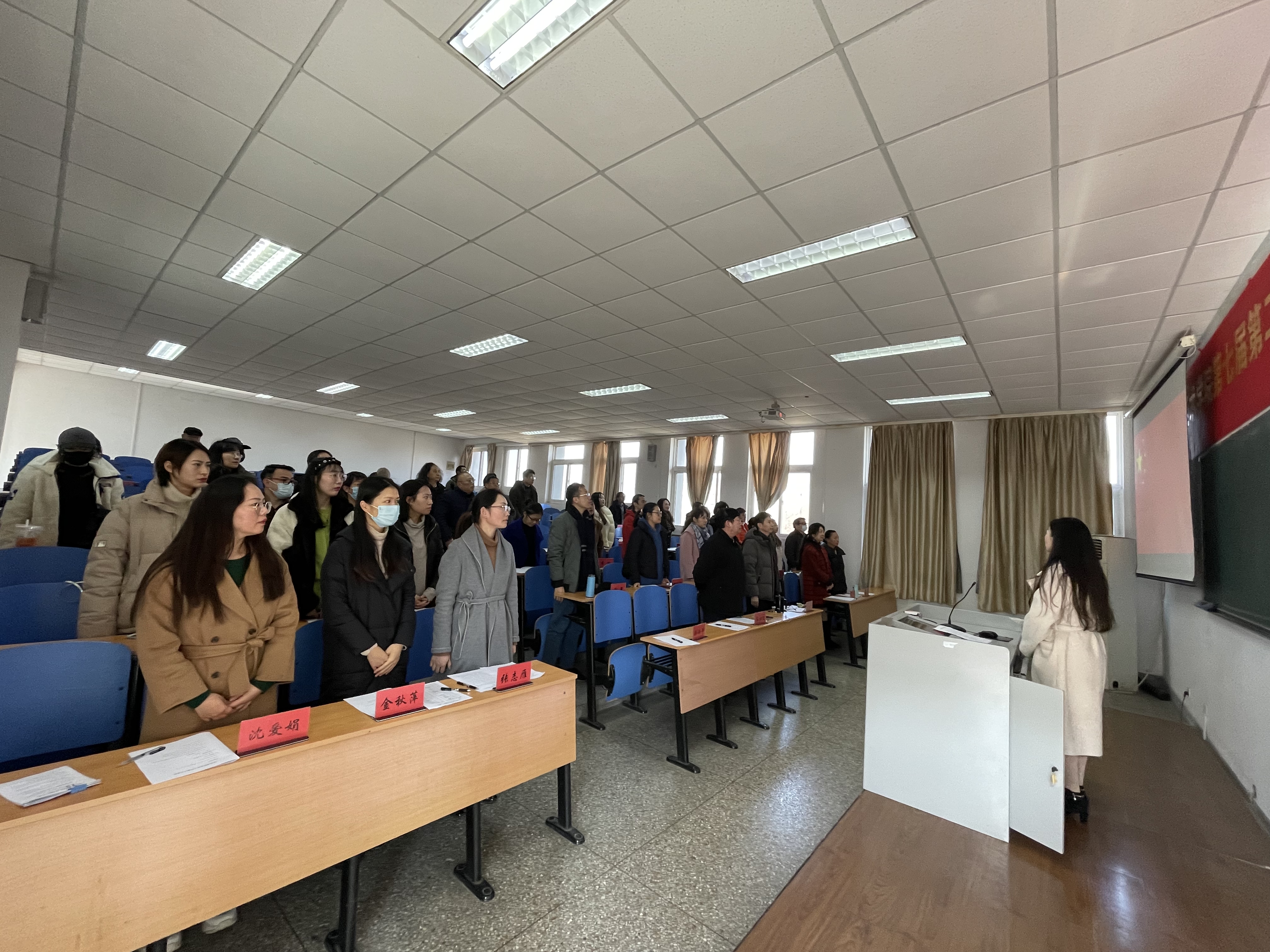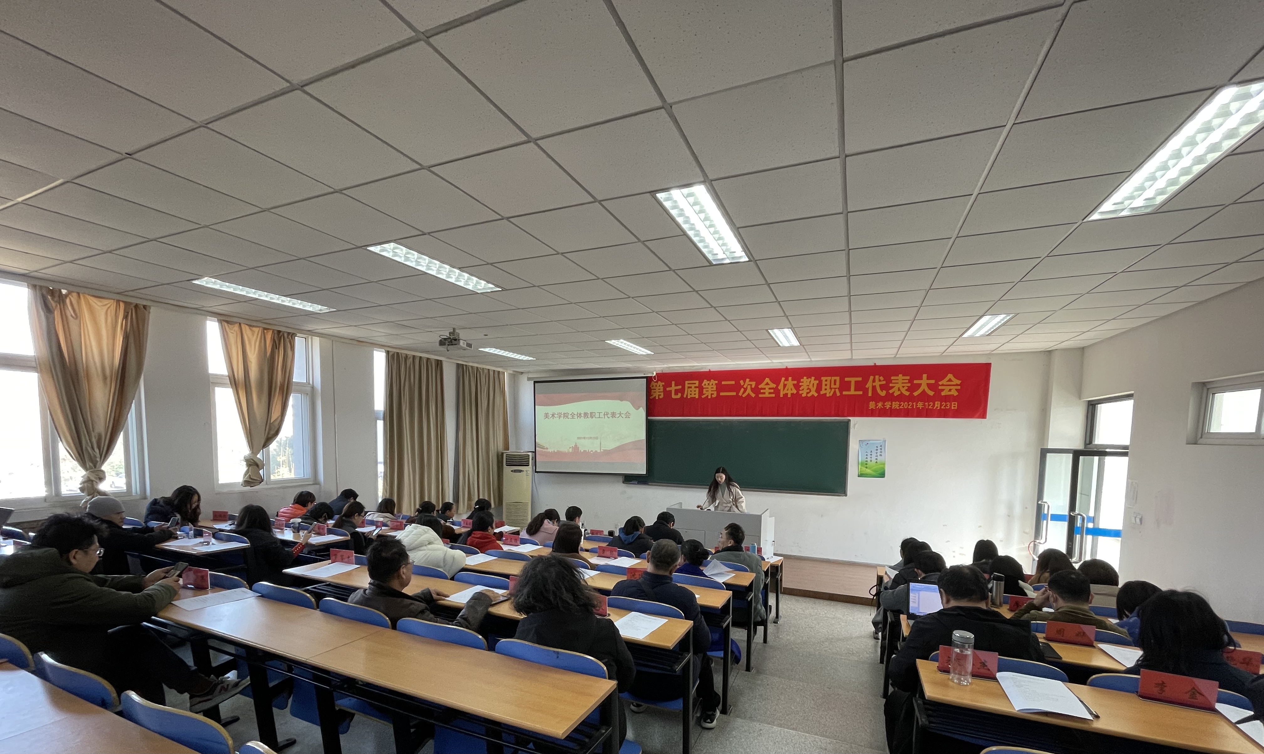 2021年12月23日中午,经校工会批准,美术学院第七届第二次全体教职工代表大会在美术学院236室胜利召开,会议由美术学院院长助理刘雨萱主持。会议召开前学院分工会和教代会筹备组作了细致精心的准备工作,制定了会议流程、准备系列相关文件,美术学院全体职工参加了此次会议。