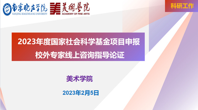 为做好我院2023年国家社科基金项目申报工作,增强教师队伍的科研能力,提高项目申报质量,提升学院国家级课题申报成功率,按照学校和学院的工作部署,美术学院于2月5日上午组织开展2023年度国家社会科学基金项目专家线上咨询指导论证。美术学院院长张建军教授邀请了清华大学陈池瑜教授、同济大学邹其昌教授、华东师范大学朱浒教授3位专家开展咨询论证,对美术学院专任教师申报的8个项目进行交流辅导,帮助支持项目申请人找准自身研究优势与课题指南的结合点,切实提高申报文本质量。美院申报人员钱锡仁、黄展、周晔、阎盈汐、赵楠艳、邹轶泓、苏丹、何金安8位教师参加此次咨询论证。
